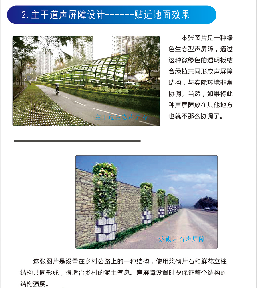 為減輕行車噪聲對附近居民的影響而設置在鐵路和公路側旁的墻式構造物。隔音墻也稱為聲屏障。在聲源和接收者之間插入一個設施,使聲波傳播有一個顯著的附加衰減,從而減弱接收者所在的一定區域內的噪聲影響,這樣的設施就稱為聲屏障。